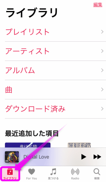 パソコンから同期した曲や、iTunes Storeで購入した曲を表示・聴くには、右下にある「ライブラリ」をタップします。