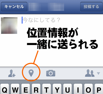 で、現在はFacebookでの位置情報はコメントを書き込むときに■色で囲まれたボタンをタップしないと送られないようになっています。