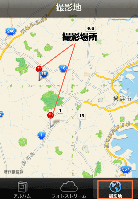 iPhoneの「写真」の画面右下の「撮影場所」をタップすると、地図が表示され撮影地が赤いピンで表示されます。