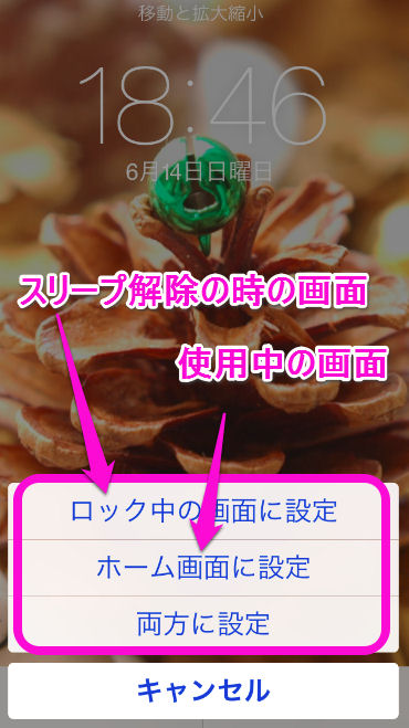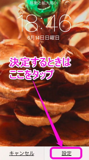 この時拡大縮小したり、位置をずらしたりできるので壁紙にしたい大きさや位置に調節して下さい。