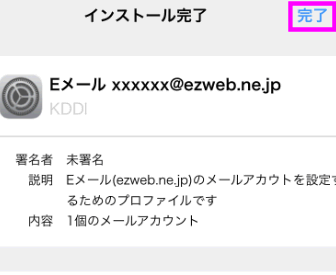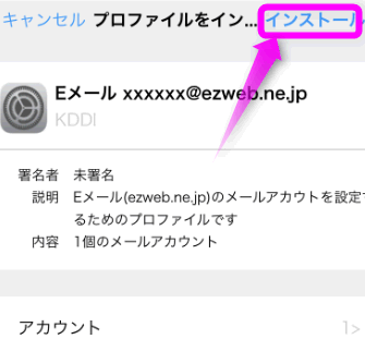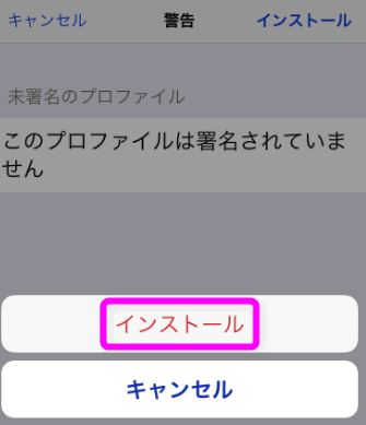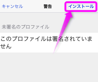 「このプロファイルは署名されていません」という警告が表示されますが、構わず右上の「インストール」をタップします。