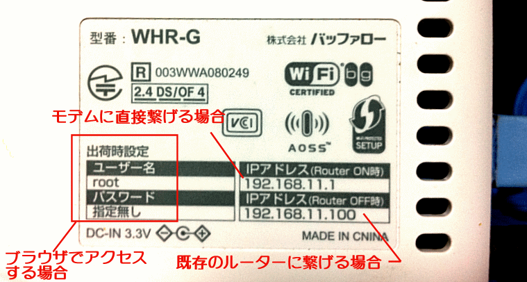 無線LANルーターの裏側には、左の画像のような説明書きが記入されているので、ここに記述された(もしくは説明書に記述された)IPアドレスにアクセスします。