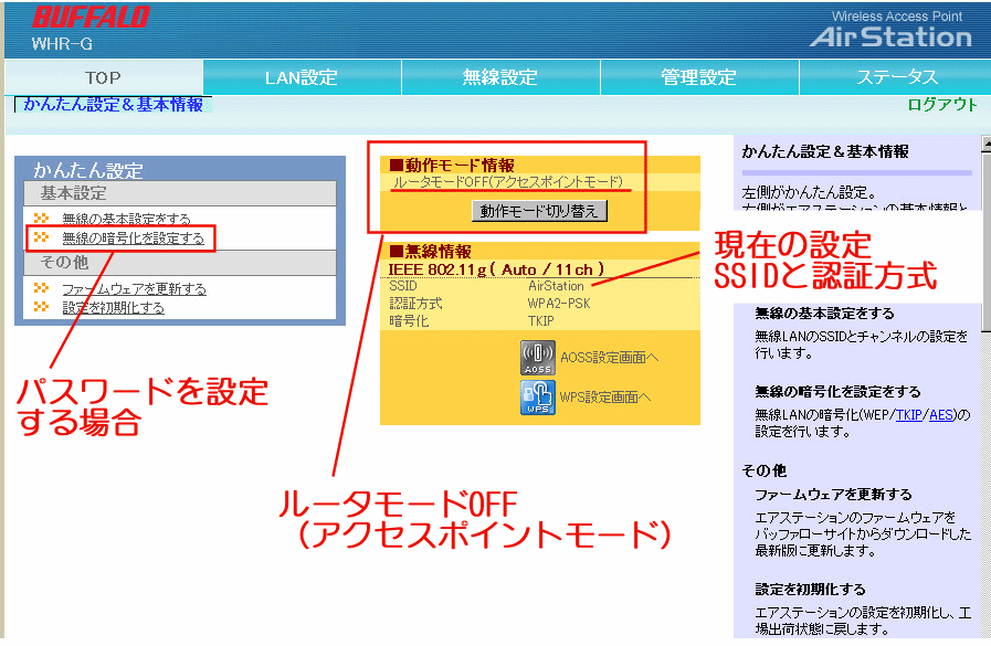 ルーターに繋げる場合は「ルーターオフ」か「アクセスポイントモード」にする。