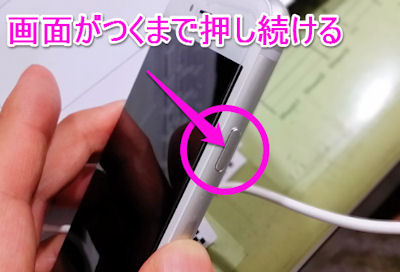 やはり向かって右側(iPhone5sまでは側面ではなくて上面だった)に、電源ボタンがあるのでここを画面にリンゴのマークが出るまで押し続けます(3~5秒ほど)。