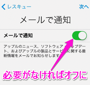 先ほど作成したメールアドレスにAppleの広告や通知が来るようにするか決定します。