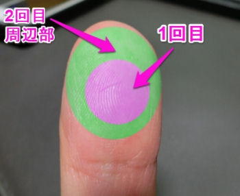 1回目の登録で指紋の真ん中辺(ピンク)を登録し、2回めの登録でその周辺(黄緑)を登録します。