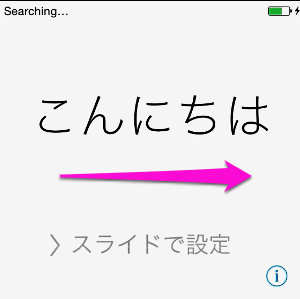 画面が点灯すると、このように「こんにちは」とか「Hello」とか、各国の挨拶が表示されるので、画面を左から右へ指でなぞります。