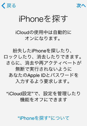 iCludを使用する設定にすると、自動的にiPhoneを探す機能がオンになります。