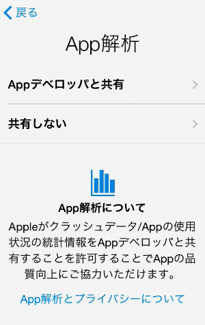 アプリに不具合があった時にアプリ開発者へデータを送信する「App解析」の設定です。