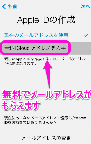 Apple IDはメールアドレスが必要になりますが、無料でメールアドレスがもらえるので「無料iCloudアドレスを入手」をタップします。