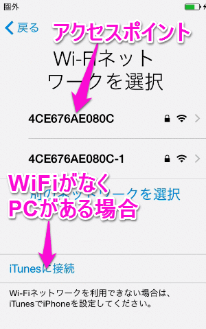 もし、Wi-Fiがある場合は、この画面で接続するアクセスポイントが表示されるので、接続したいアクセスポイントをタップします。