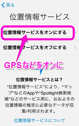 「位置情報サービス」では、「位置情報サービスをオンにする」という部分をタップします。