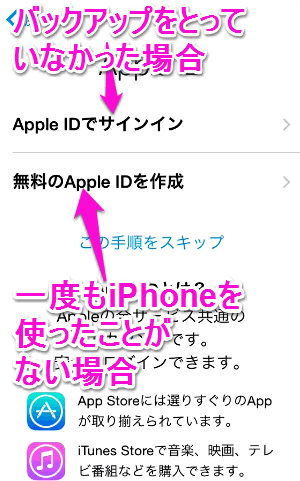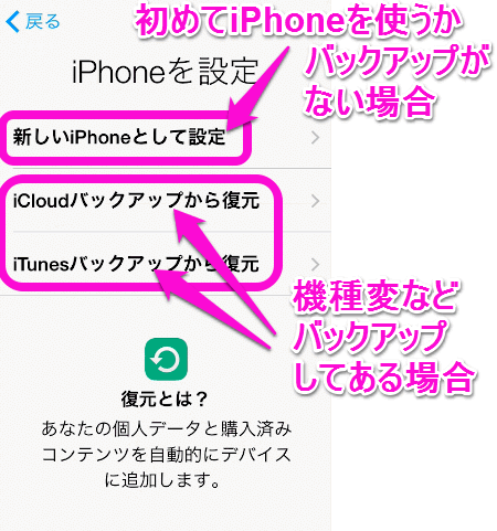 すでにiPhoneを使っていて、機種変などで買い替えた場合や故障などして初期化した場合などで、あらかじめバックアップをとっている場合は、「iCloudバックアップから復元」か「iTunesバックアップから復元」を選択してください。