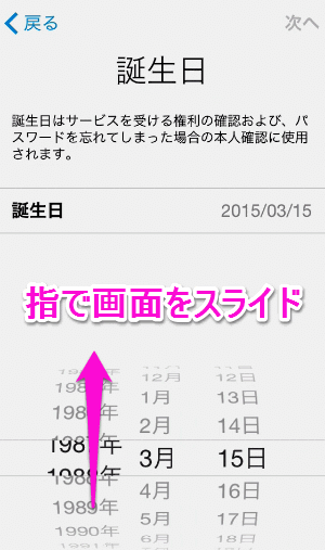 生年月日の部分を上下にスワイプすると、月日を選択できます。