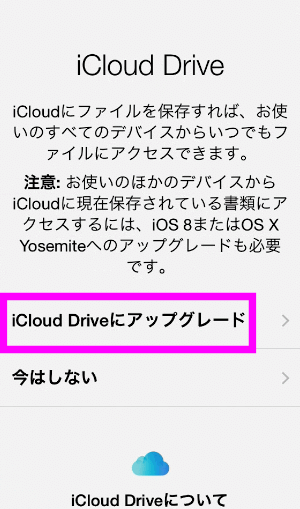 iPhoneのデータだけでなく、いろいろなデータをインターネット上に保存できる「iCloud Driveにアップグレード」をタップします。