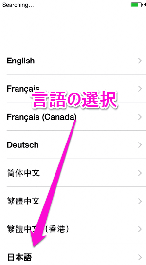まずは言語の選択。「日本語」という部分を探し、ここをタッチします。