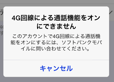 SoftbankのiPhoneの場合、このように「4G回線による通話機能をオンにできません」「このアカウントで4G回線による通話機能をオンにするには、ソフトバンクモバイルに問い合わさえてください」というエラーが出てしまう場合、VoLTEオプションに未契約なのが原因。