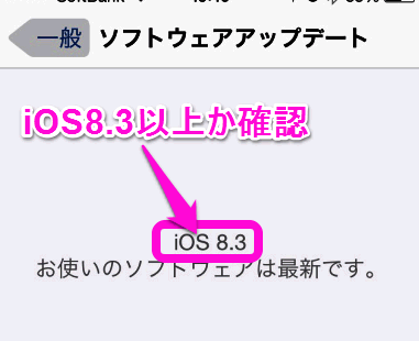 「iOS8.3」より大きい数字か、「お使いのソフトウェアは最新です」と表示されていれば、iOSのバージョンはOKです。