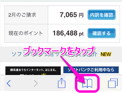 Safariを立ち上げ、画面下のブックマークをタップします。