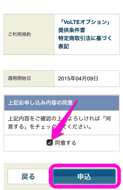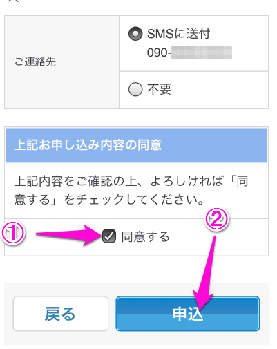「上記お申し込み内容の同意」にチェックを入れ、「申込」をタップします。