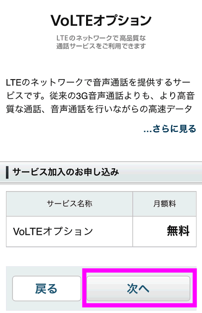 VoLTE サービス加入のお申し込みが表示されるので、「次へ」をタップ。