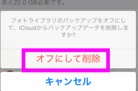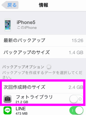 「バックアップ」の「フォトライブラリ」をオフにすると、ネット上に保存してあるiPhoneで撮影した写真や動画がすべて削除されます。が、iPhoneの中に保存されている写真や動画はそのまま残るので、もし、この容量が大きすぎてバックアップが出来ない場合は、このようにiCloudにバックアップするのはあきらめて、パソコンに保存した方がいいかもしれません。