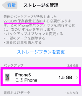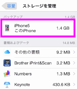 先ほどの「設定」→「iCloud」→「ストレージを管理」まで進み、「iPhone」をタップします。