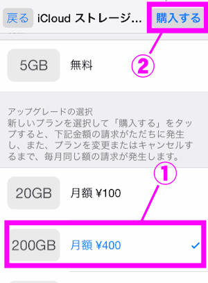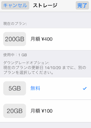私の場合は、写真の容量が20GBを超えてしまっていたので、200GB(400円/月)を選択しました。