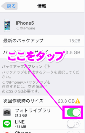 もし、このようにフォトライブラリの容量が大きい場合、ここをタップしてオフにします。