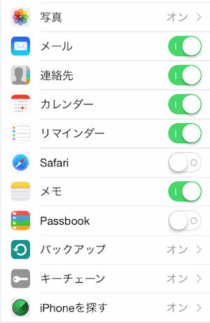 基本的には、「連絡先」「カレンダー」「リマインダー」「メモ」「バックアップ」「キーチェーン」「iPhoneを探す」はオンにしておきます。