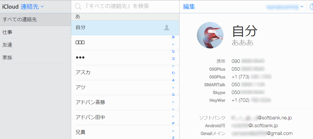 「連絡先」を開くと、このようにパソコン上からもiPhoneに保存された連絡先を見ることができます。