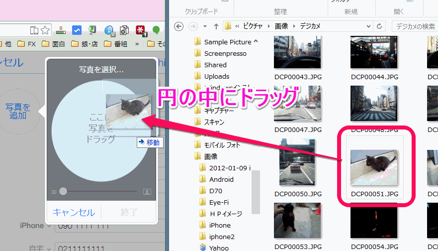 パソコンに保存されている写真を「ここに写真をドラッグ」にドラッグすると・・・