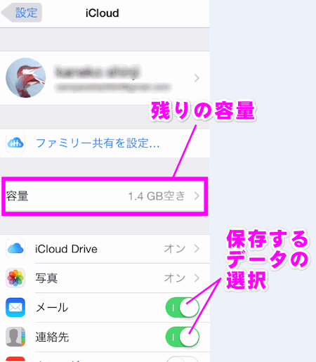 「容量」は、iCloudに使用しているデータの容量と、どれくらい使用できるかが表示されています。
