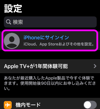 設定を開き、一番上(検索の下)がこのように「iPhoneにサインイン」と表示されている場合、iCloudはオフになっています。