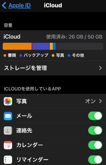その下のアプリのリストは、iCloudに保存するアプリのデータのオン・オフです。