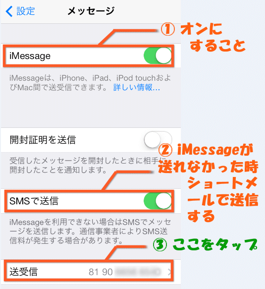 ①の「iMessage」がオンになっていることを確認して下さい。