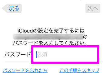 iCloudの設定をするため、パスワードを入力します。