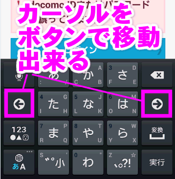 Androidの場合、このようにカーソル移動用の左右のボタンがあるので、文字を間違えた時など、修正が楽でした。