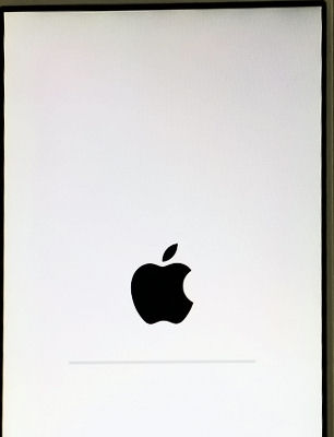 再起動が完了すると、またこの白い画面とりんごのマーク、そして進行状況を示すバーが表示されました。が、今度は少し進行が早いようです。