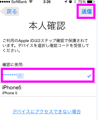 電話番号かiPhoneに確認コードを送信するので、どちらに送信するか選択します(どちらもiPhoneなんですが・・・)