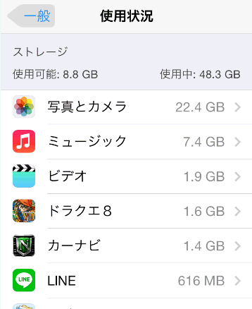 iPhoneの内部ストレージの使用状況と空き容量が確認できます。
