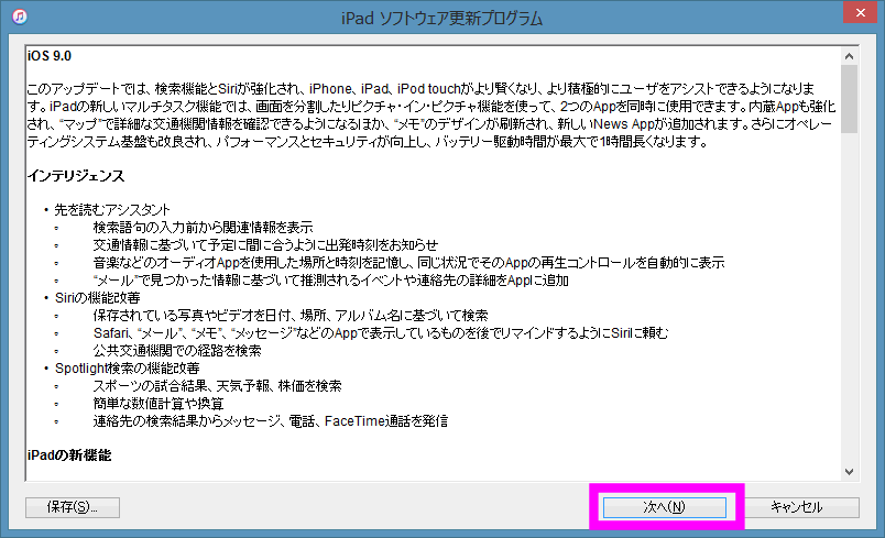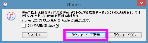 iTunesを立ち上げ、パソコンとiPhoneやiPadをUSBケーブルで接続すると、自動的にアップグレード用の画面が表示されました。
