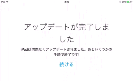 時間にして1時間ほどでしたが、実際には30分ぐらいエラーでダウンロードが出来なかったのと、あと、iPhoneとiPadを同時進行でアップグレードしていたので、もっと短時間で終わってたと思います。