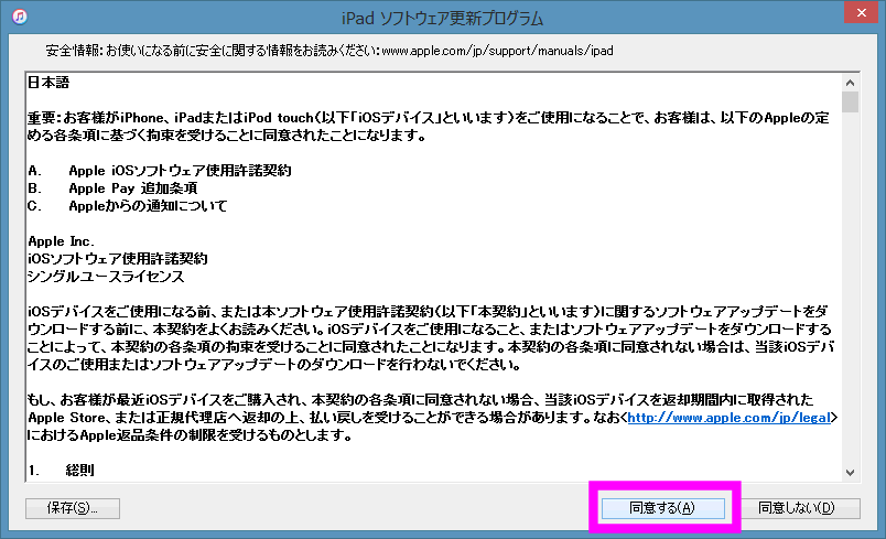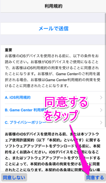 iOS使用許諾契約書が表示されるので、「同意する」をクリックします。