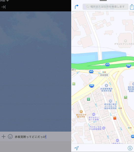 画面を分割して2つのアプリを表示させることが出来ます。iPadのディスプレイの右端から指でスワイプすると、対応したアプリを左3分の1に表示させることが出来ます。