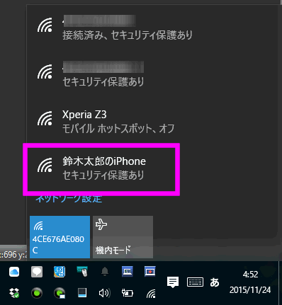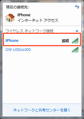 すると近くのアクセスポイントの一覧が表示されるので、「iPhone」と書かれている部分をクリックします。