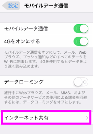ここをタップすると、すぐにインターネット共有の画面を表示させることが出来ます。