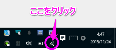 Wi-Fiに対応しているノートパソコンは、タスクバーの時計表示部分辺りに、このような扇形のアイコンがあるので、ここをクリック。
