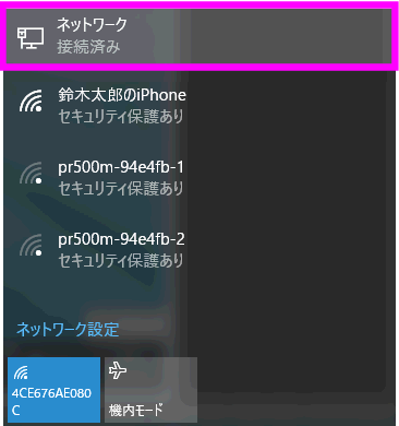 このように一番上に「ネットワーク 接続済み」という表示が出てれば接続中を示しています。