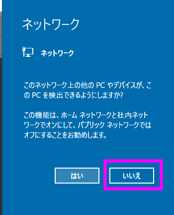 もし、「このネットワーク上の他のPCやデバイスが、このPCを検出できるようにしますか」という警告が出た場合は、「いいえ」をクリックしてください。